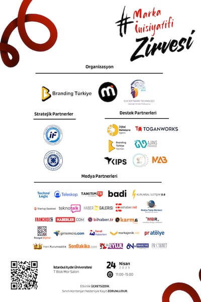 Ekosistem paydaşları tarafından desteklenen Marka İnisiyatifi Zirvesi’nin 1. etkinliğine İstanbul Aydın Üniversitesi ev sahipliği yapacak. Bu bağlamda Branding Türkiye, Eva Software Technology ve Marka İnisiyatifi organizasyonuyla gerçekleşecek olan bu etkinliğin stratejik partneri İstanbul Aydın Üniversitesi ve İstanbul Aydın Üniversitesi İletişim Fakültesi olurken etkinliği destekleyenler arasında Toganworks, Ajans Paradise, KIPS Türkiye, Branding Türkiye Yayınları, Eva & Luna App ve MAB yer aldı. 24 Nisan 2025’teki etkinliğin medya ve destek partnerleri arasında ise PR Atölye Dergisi, Technologic, Teleskop App, Tanıtım Tr, Badi Etkinlik, Kurumsal İletişim 2.0, Startup Gazetesi, TeknoTalk, Haber Galerisi, EsHaber, Medya Takip Merkezi, Franchise Market Türkiye, , Haberler.com, BiHaber.TR, Karma Türkiye, Medya Bilgi Rehberi, Sosyal Dijital, Girişimcio, Sanat Haberleri, Markajenik.net, Hani Kurumsaldık, SonDakika.com, 9 Eylü Gazetesi, 6N Magazine, PR Carnet Dergisi yer aldı.